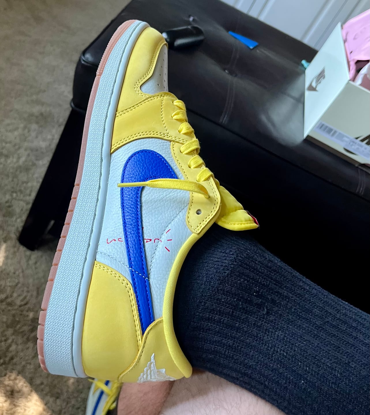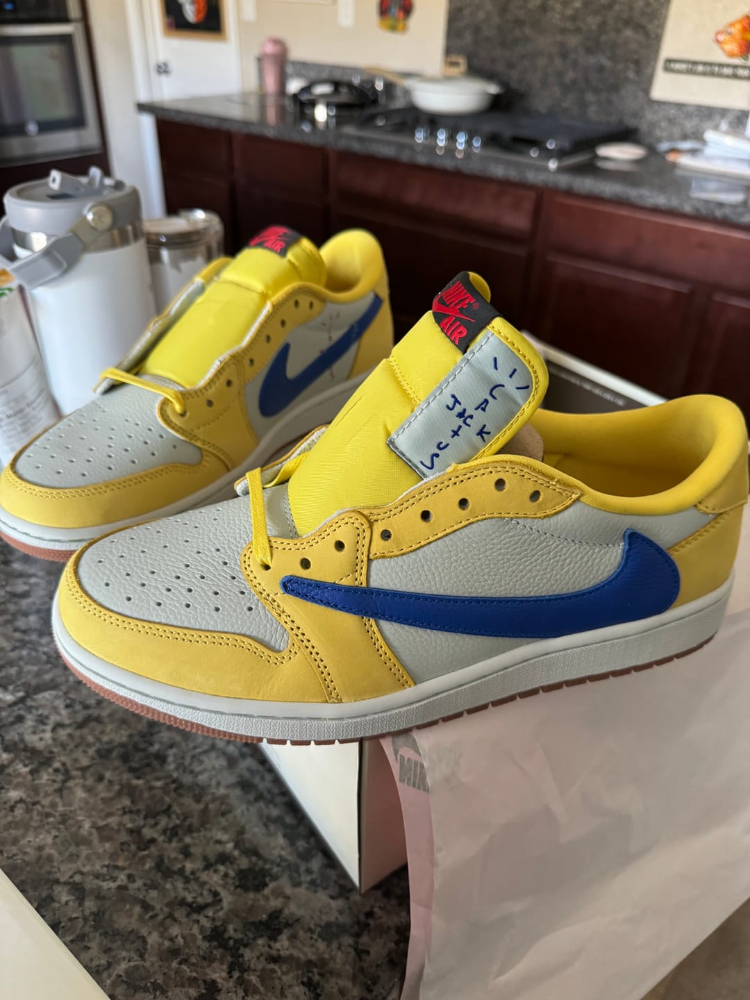 These run true to sizeLa Flame is back with another banger. presenting the Travis Scott AJ1 Low OG 'Canary'. Inspired by his high school. Elkins High Knights. this edition boasts a vibrant Yellow Canary. Racer Blue. Light Silver. and Gum Brown color palette. Retaining signature elements like the reversed check and Cactus Jack branding. it offers a fresh take on previous releases with it's unique color scheme. A White midsole with cushioning in the heel provides comfort. while a Gum Brown rubber outsole ensures traction. Featuring yellow. red. and blue laces. Cactus Jack branding on the lateral quarter. left heel tab. and insoles. and finished with white midsoles and soft brown outsoles. the 'Canary' stands out as a rare departure from Travis Scott's typical earthy tones in his AJ1 collaborations.
