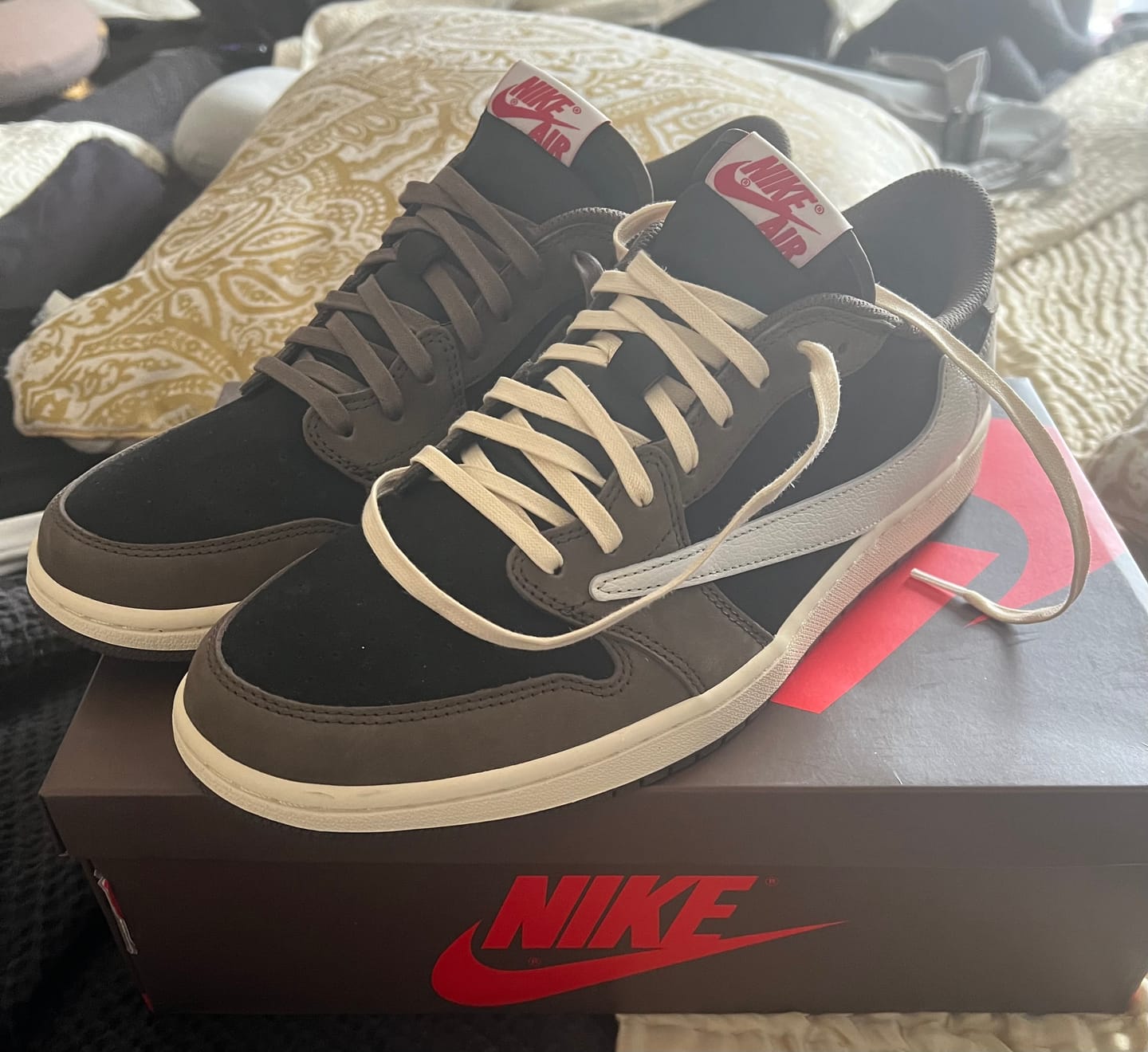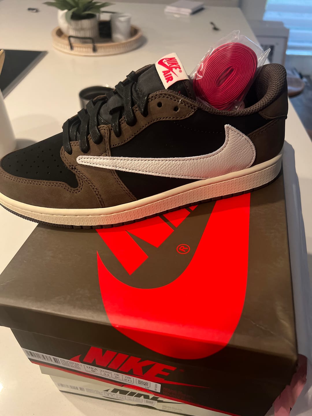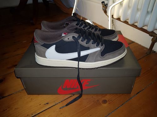 Awesome high-quality replicas! They look great and they feel great. The size seems true to the AJ1. I usually wear a 9.5US in Nikes but go down to a 9 in the AJ1. Small incorrect detail… there are two “R” circles for the trademark on the tongue tag. This is the only thing that is off from my authentic Travis lows.