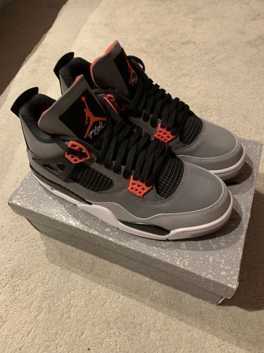 These fit true to size.The AJ4 Retro 'Infrared' features distinctive colour blocking that recalls the 'Green Glow' AJ4 release from 2013. The upper is crafted from smooth nubuck in a charcoal finish. A lighter shade of grey distinguishes the forefoot overlay. while black accents land on the quarter panel netting. structural wings and J heel tab. The sneaker's titular hue lights up the woven tongue tag and a quartet of moulded eyelets. A polyurethane midsole packs visible A sole cushioning in the heel for a smooth ride.