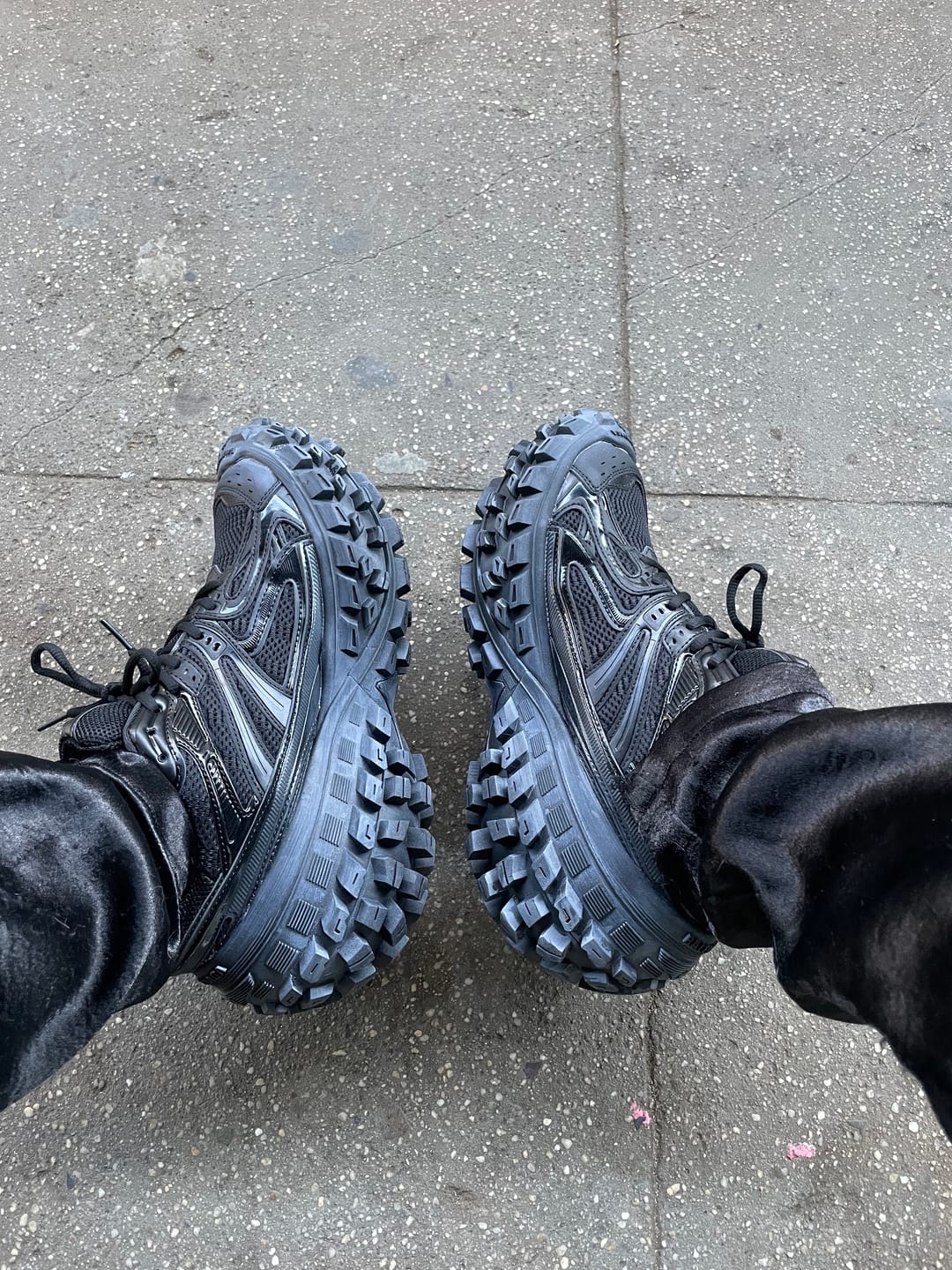 These run large. sizing down recommended.B's iconic 'Defender' sneakers. now reintroduced through the SS23 Red Carpet Collection as the 'Bouncer'. take sporty mesh uppers to the next level with a bold twist. The super chunky tire tread outsole. a hallmark of B's innovative design. adds a unique and dramatic element to this oversized sneaker. The 'Black' colorway maintains its distinctive and edgy style. offering a fusion of sporty aesthetics and contemporary fashion. These sneakers are more than just footwear; they are a statement of individual style and B's commitment to pushing the boundaries of fashion.