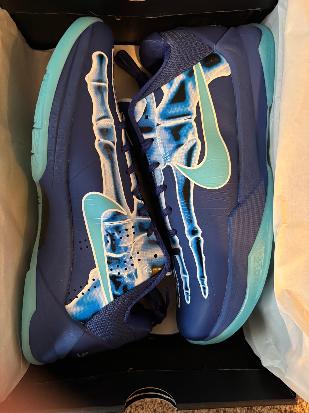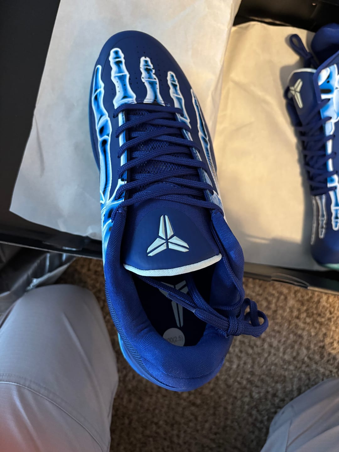 These run true to sizeThe Kobe 5 Protro X-Ray pays vibrant homage to Kobe Bryant's career. drawing inspiration from the iconic X-ray T-shirt featuring his hand with five championship rings. This bold sneaker brings the X-ray concept to life with glow-in-the-dark elements. showcasing an X-ray foot graphic on the deep royal. baltic. and glacier blue upper and outsoles. Part of the Protro series. it fuses the original Kobe 5 design with modern performance tech. making it a top choice for athletes and sneakerheads alike. This iteration celebrates the Mamba Mentality. capturing Kobe's enduring impact on the game.